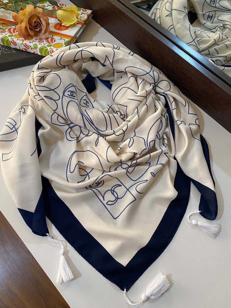 روسری نخ سیااسکارف منگوله دار نرم و لطیف کیفیت بینظیر سایز ۱۴۰ رنگ محصول به خاطر تغییرات نور ممکن است یک یا دو درجه با رنگ واقعی کار متفاوت باشه